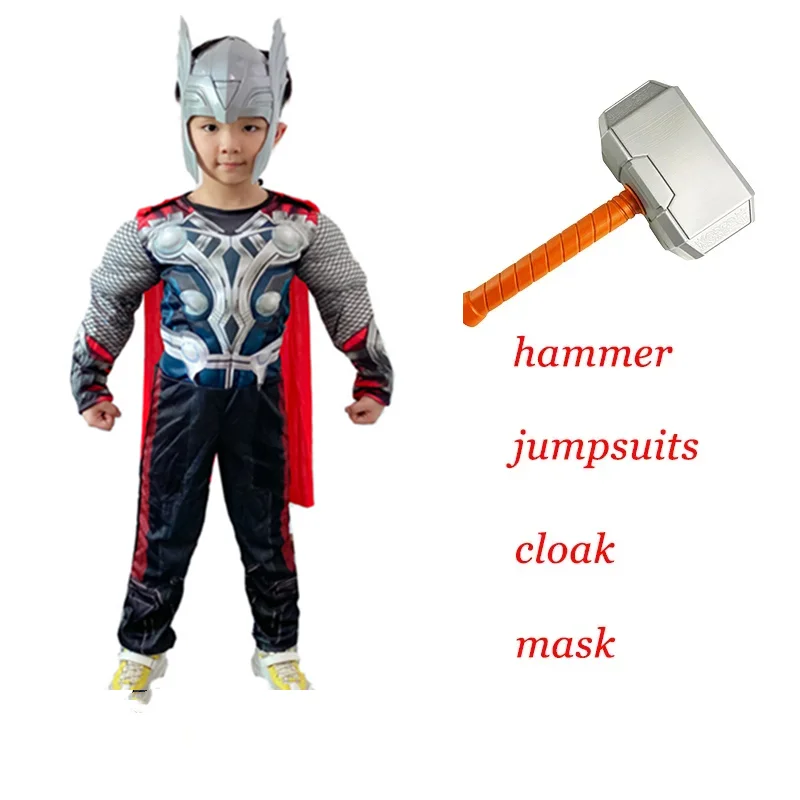 Halloween Carnival Clothes for Children Kids Thor Muscle Costume Superhero Thor Cosplay Muscle Costume Jumpsuit Mask Hammer