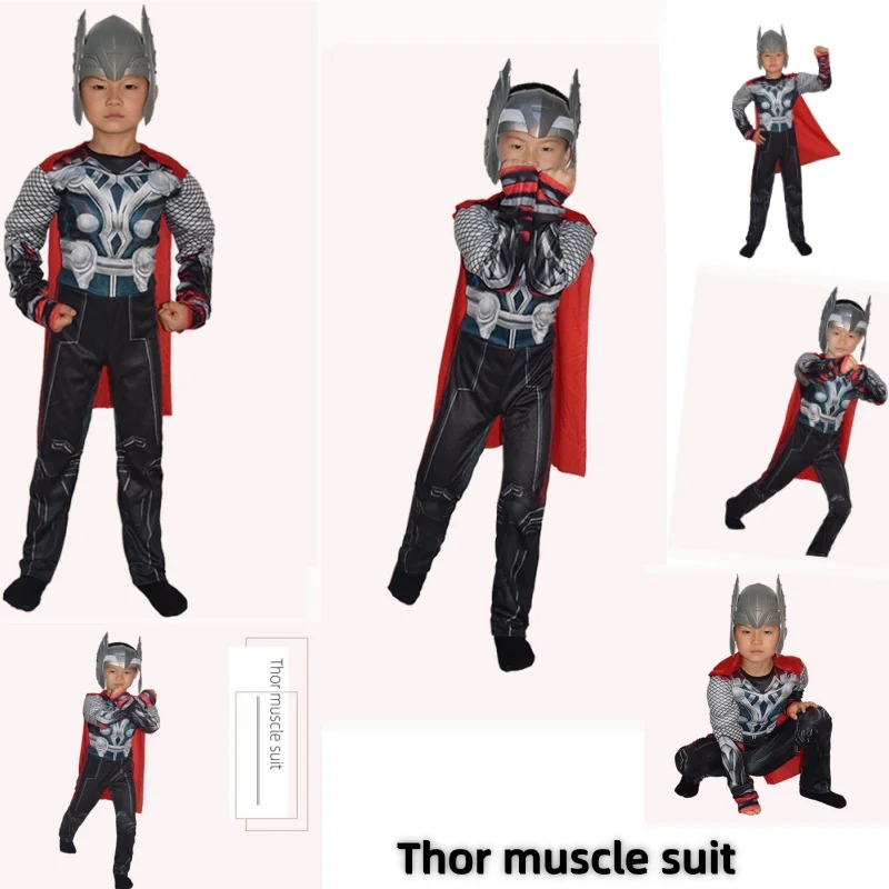 Halloween Carnival Clothes for Children Kids Thor Muscle Costume Superhero Thor Cosplay Muscle Costume Jumpsuit Mask Performance