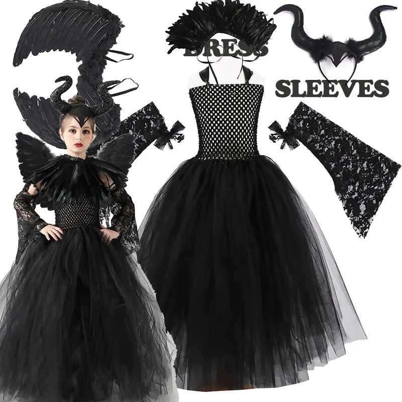 2024 New Maleficent Halloween Costume Maleficent Tulle Dress for Girls Cosplay Evil Queen Black Mesh Princess Dress Kids