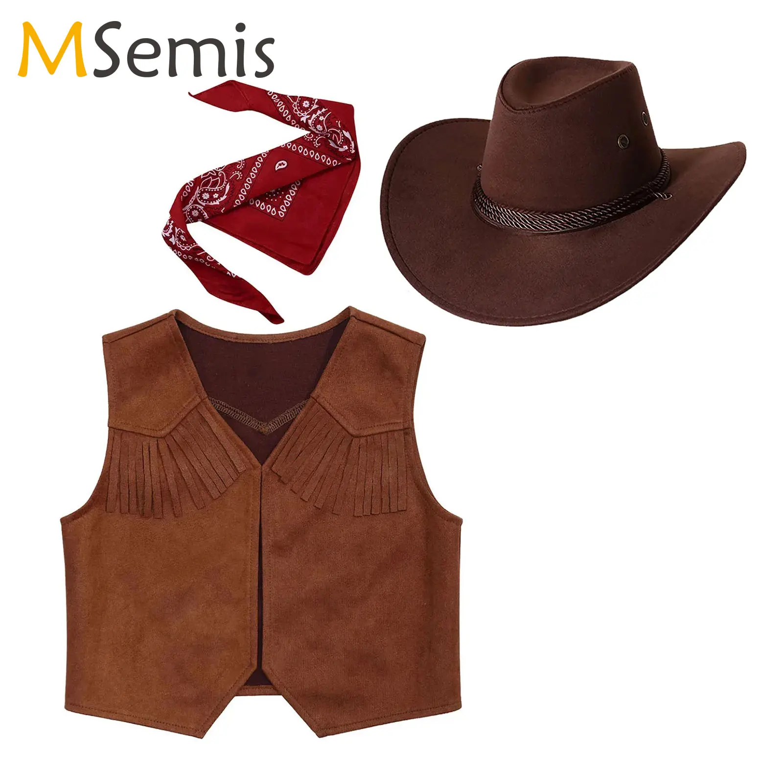 Kids Western Cowboy Costume Suede Leather Fringe Vest with Bandanna Felt Hat Halloween Wild West Cowgirl Cosplay Party Dress Up