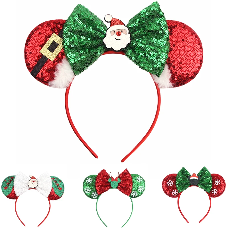 1pc Disney Christmas Hair Accessories Sequins Bow Mickey Mouse Ears Santa Claus Decoration Holiday Party Wear Deer Horn Headband