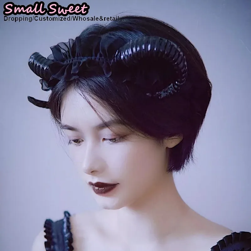 Goth Cosplay Hair accessories Harajuku Gothic Lolita Y2K girl Punk Floral Lace Ruffled hair band ram's horn Headband Hair Hoop