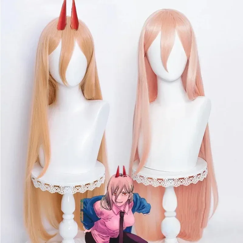 Anime Chainsaw Man Makima Power Cosplay Wig Long Orange Pink Heat Resistant Synthetic Hair Party Role Play Wigs + WigCap + Horns