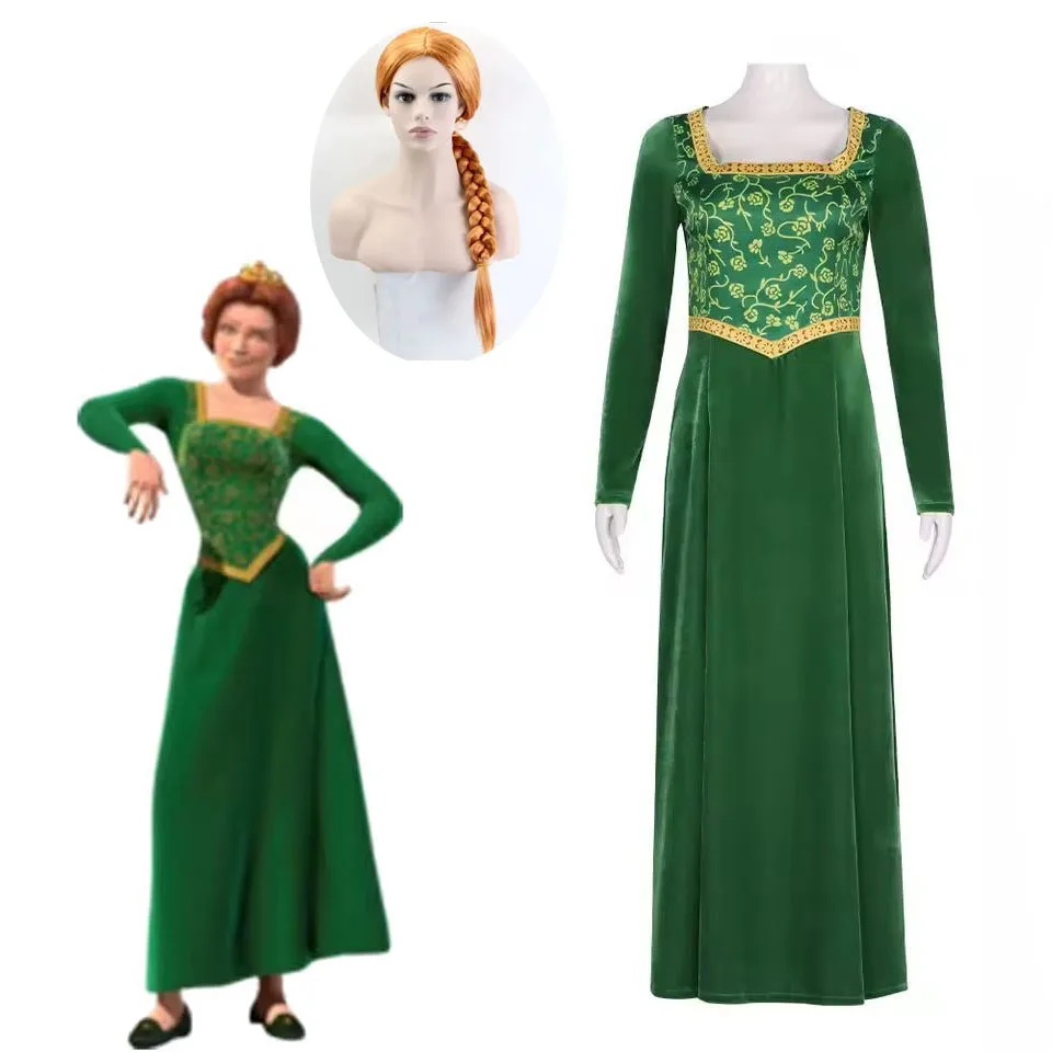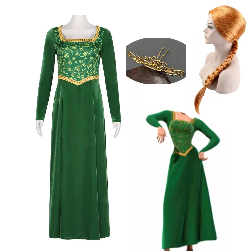 Princess Fiona Cosplay Costume Anime Shrek Wife Green Fiona Cos Dress Wigs Outfit ForLadies Women Long Dress Halloween Headgear