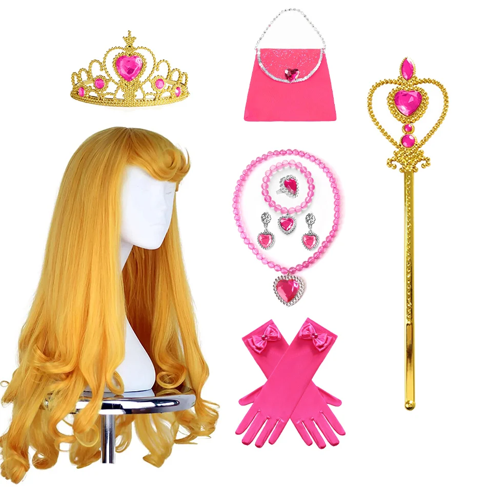 Cute Girls Aurora Cosplay Accessories for Kids Princess Role Play Dress Up Props Auroa Wig Yellow Gold Long Curly Girls Wig