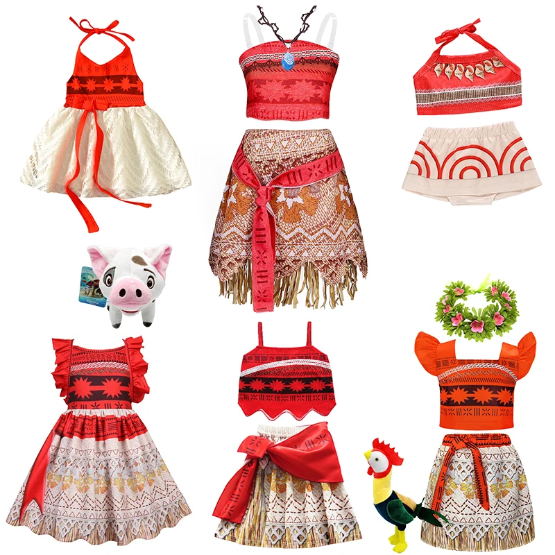 Disney New Moana Dress Kids Cosplay Girls Princess Vaiana Dress Children Birthday Party Costume with Necklace Pet Pig Chick Sets