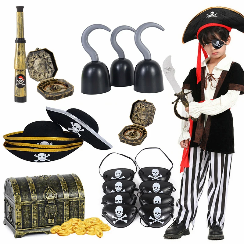 Pirate Captain Cosplay Costume Props Set Kids Halloween Hat Hook Skeleton Eye Patch Pirate Party Halloween Decoration Supplies