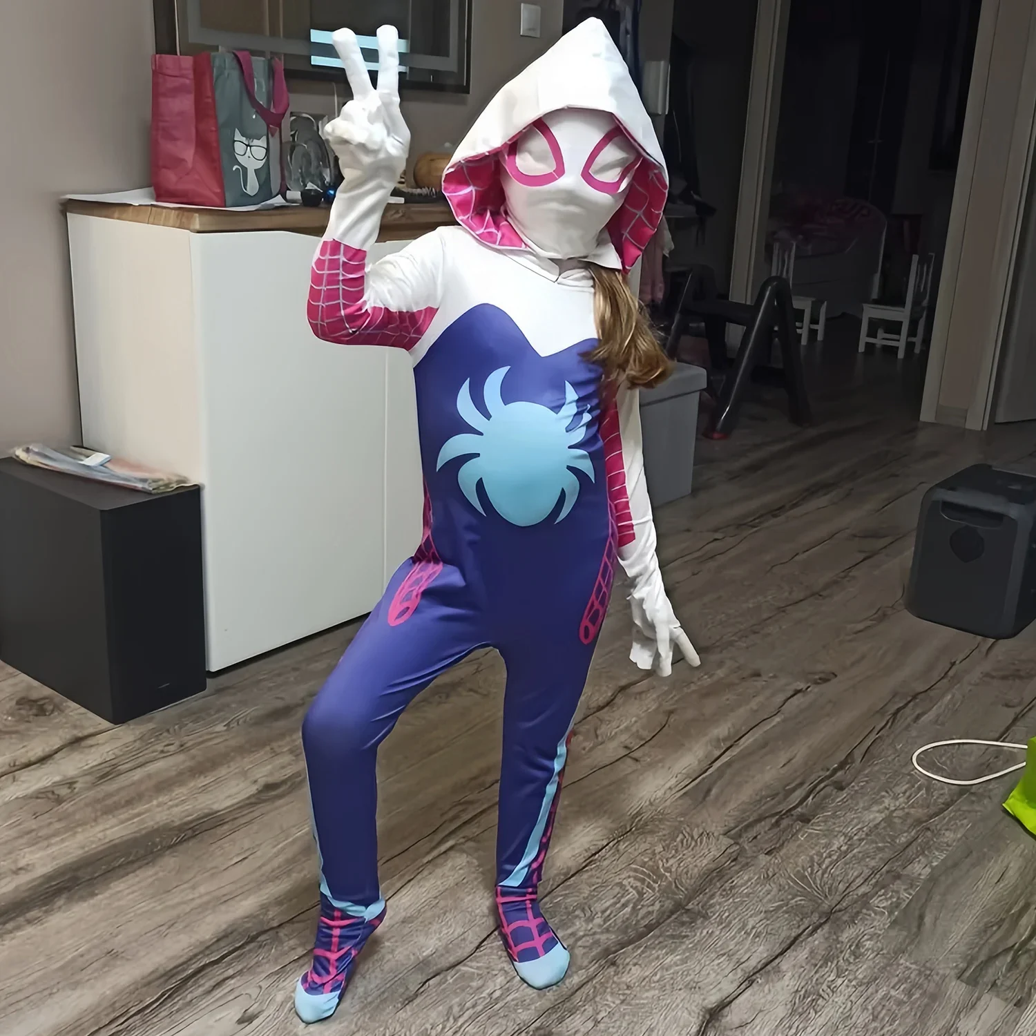 Girls Gwen Stacy Spider Costume Bodysuit Jumpsuit Adult Kids Halloween Cosplay Party Costume Fantasy Dress Up Mask Hoodies Suit