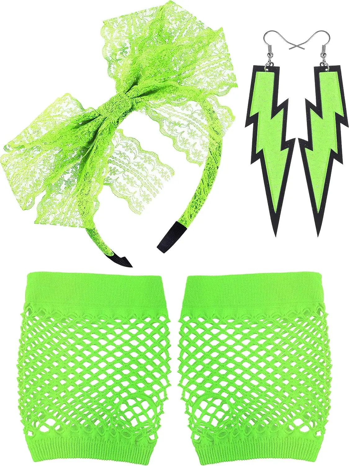 PESENAR 80's Lace Headband Neon Earrings Fingerless Fishnet Gloves for 80's Party