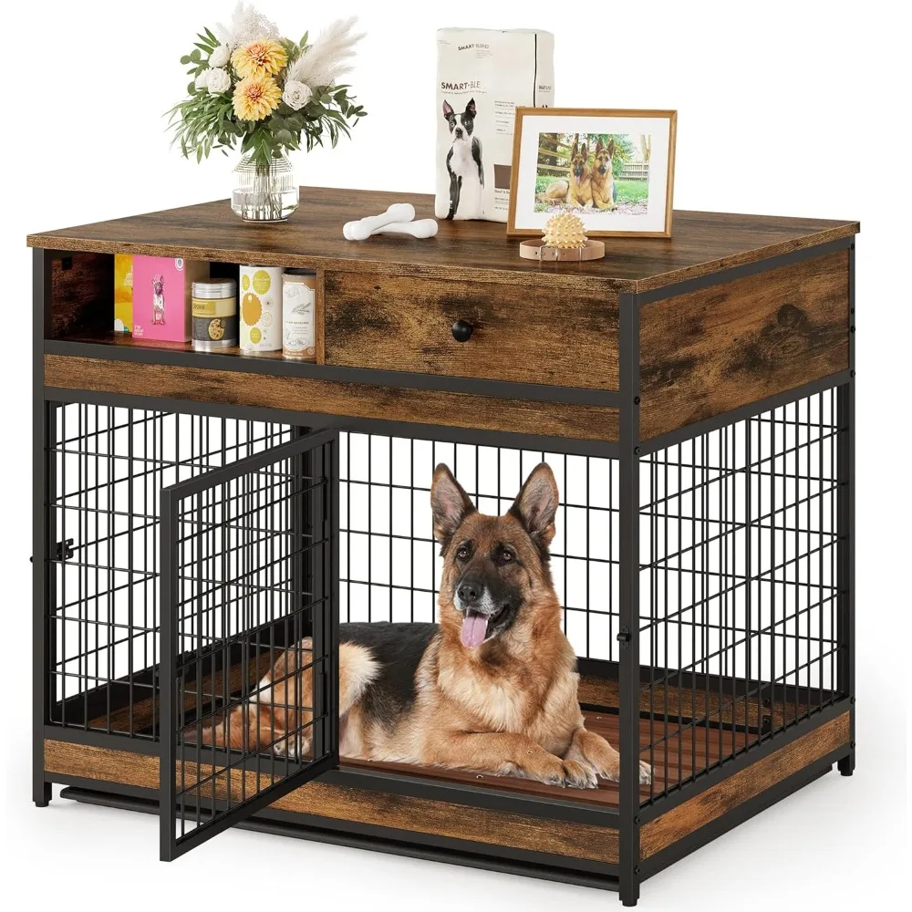 39 Inch Dog Crate Furniture for Large Dogs, Dog Kennel End Table with Drawer, Large Indoor Wooden Pet Cage with Tray