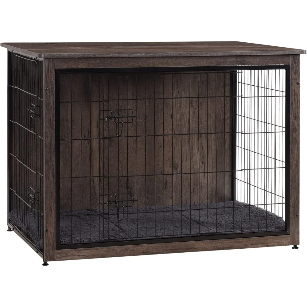 Dog Crate Furniture with Cushion, Wooden Kennel Table with Double Doors, Indoor Dog House, Extra Large Size, 43.3" L, Dark Gray