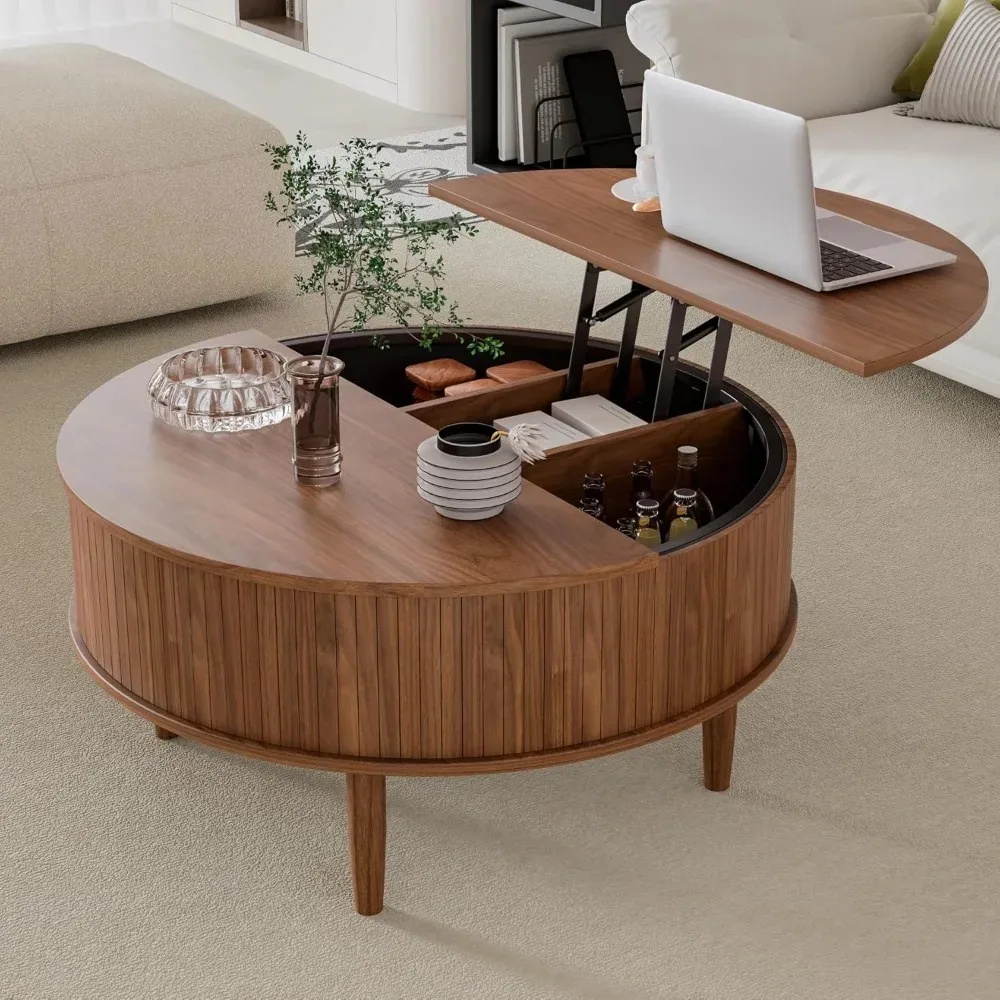 Round Fluted Lift Top Coffee Table with Storage, Mid Century Modern Coffee Table for Living Room, Home Small Space,