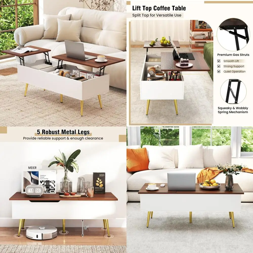 Mid Century Modern Rectangle Coffee Table with Lift Top and Two Hidden Storage Compartments
