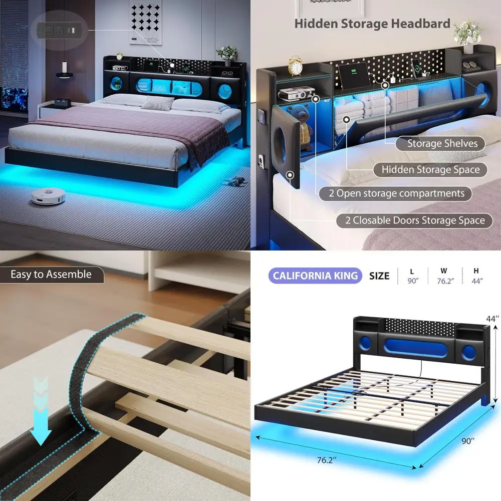 California King Bed Frames, Cal King Bed with Hidden Storage Headboard & LED Light and Charging Station, Floating Bed Frame No Box