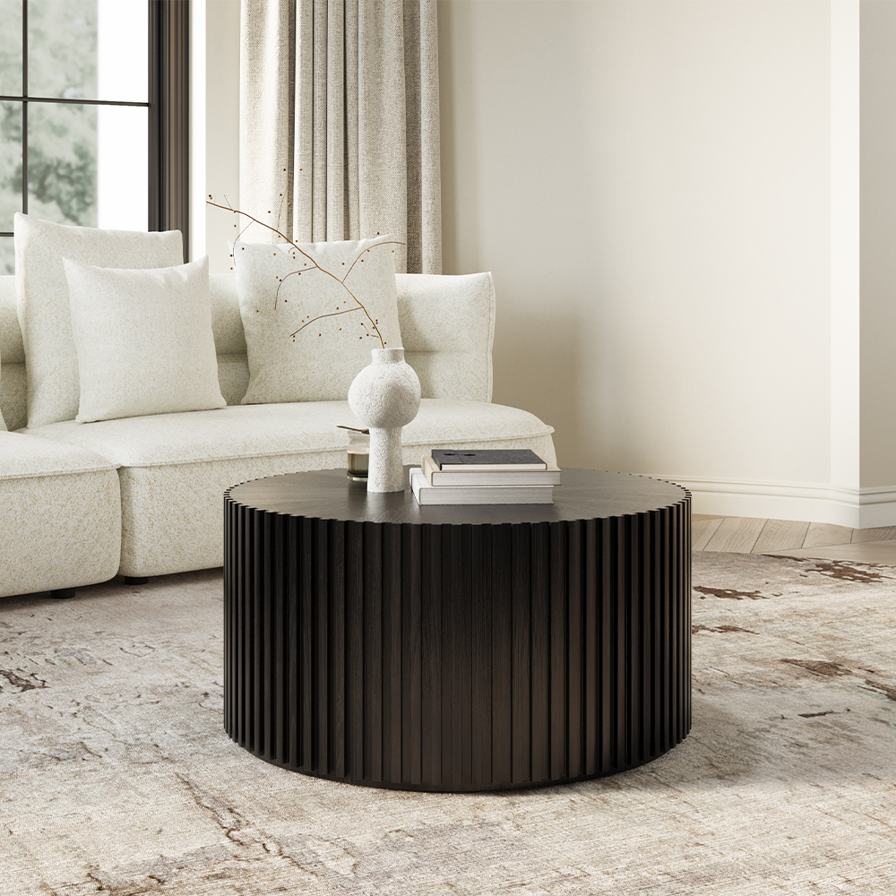 Fluted Round Coffee Table, Minimalist Wood Coffee Table, Mid Century Modern, Black, Fully Assembly, 31.5"