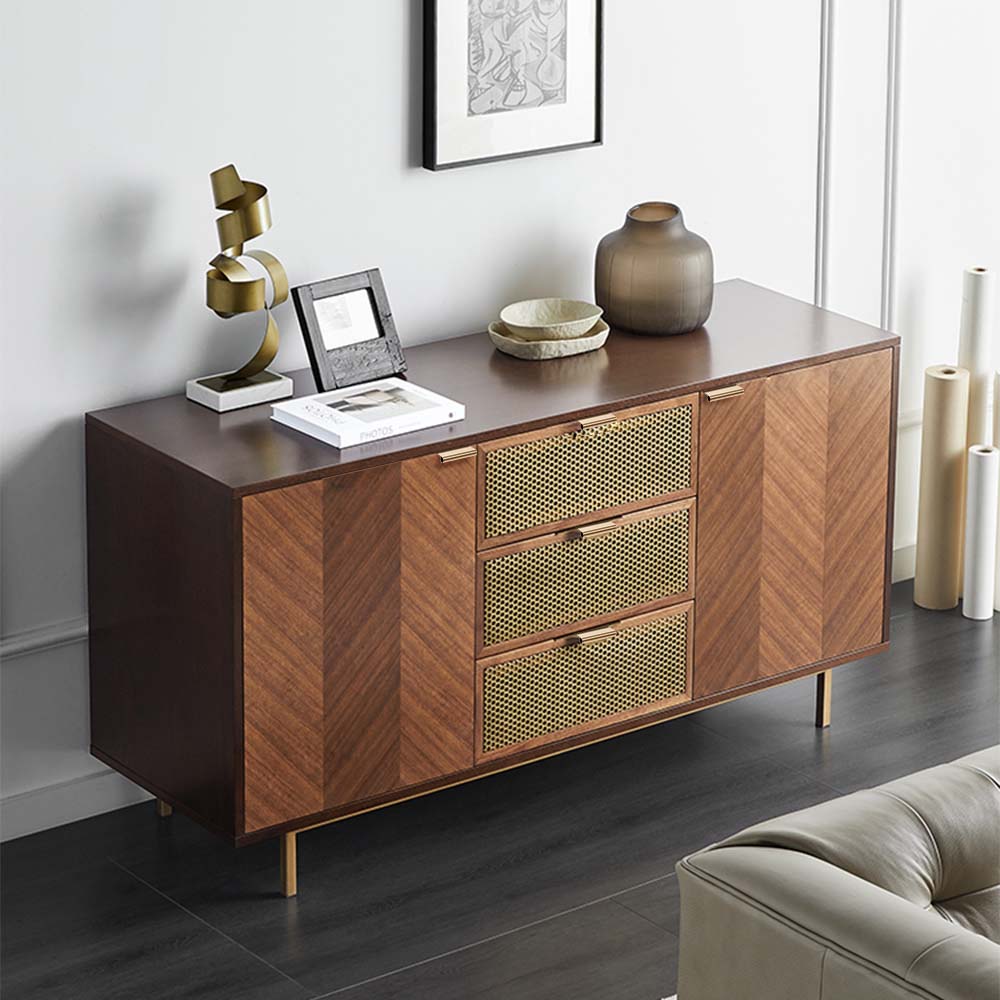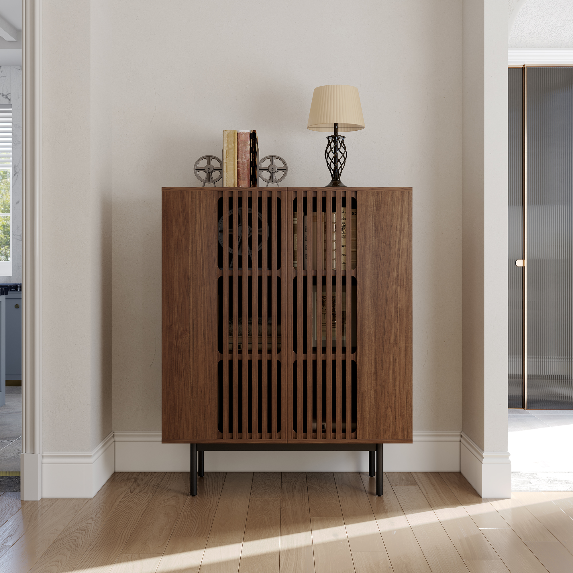 35.43" Mid-Century Modern Credenza Sideboard Cabinet, 6 Compartments, Hollow-out Design, Solid Wood Veneer, Metal Legs, Wood Accent Chest