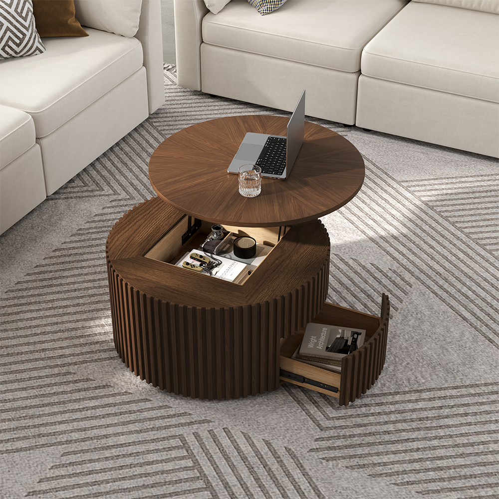 31.5" Lifting Top Round Coffee Table, Mid-Century Modern Wood Coffee Table, Fluted Coffee Table with Hidden Storage and Drawer, Walnut Color
