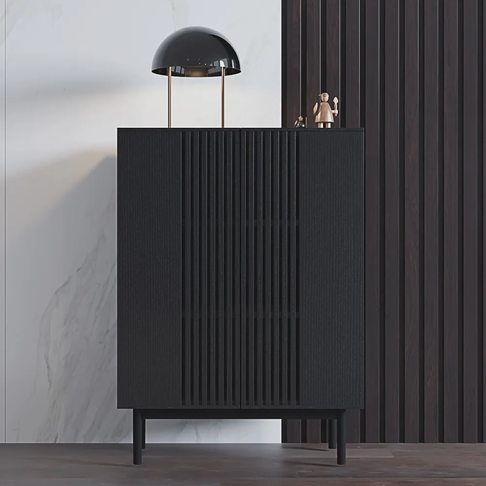 35.43" Mid-Century Modern Credenza Sideboard Cabinet, 6 Compartments, Hollow-out Design, Solid Wood Veneer, Metal Legs, Black Accent Chest