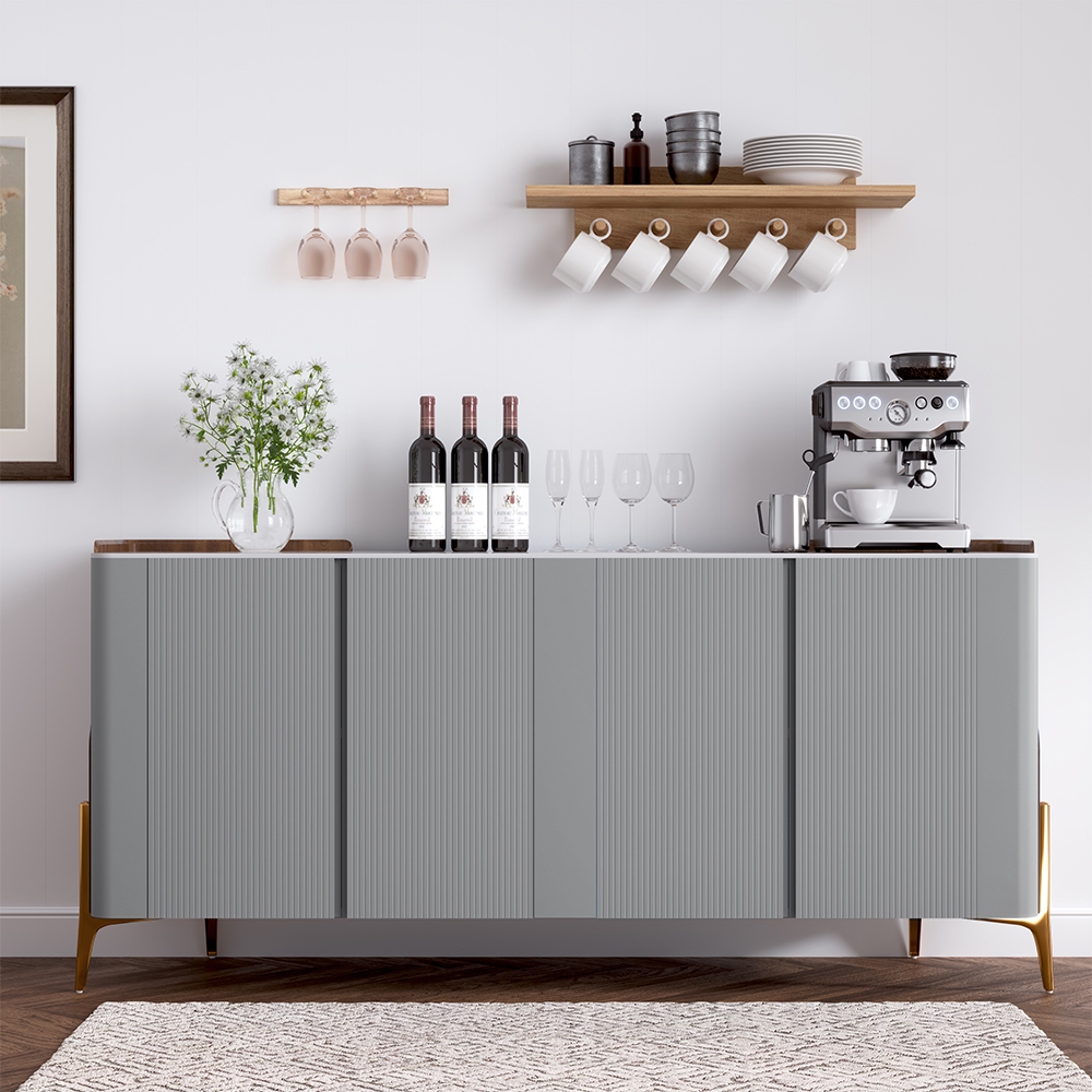 70" Modern Luxury Credenza Sideboard Buffet Cabinet with Pandora Sintered Stone Table Top, MDF Bar Cabinet with 4 Cabinets for Kitchen Storage & Bookshelf, Gray & Gold Buffet Hutch for Dinning Room