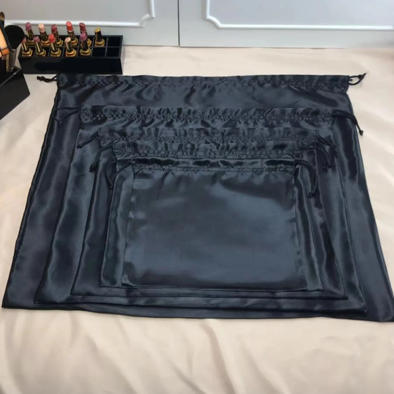 Large Silk Satin Drawstring Care Bag Custom Wigs Storage Dust Proof Packaging Pouch Black Reusable Sack Handbag Shoes Travel Bag