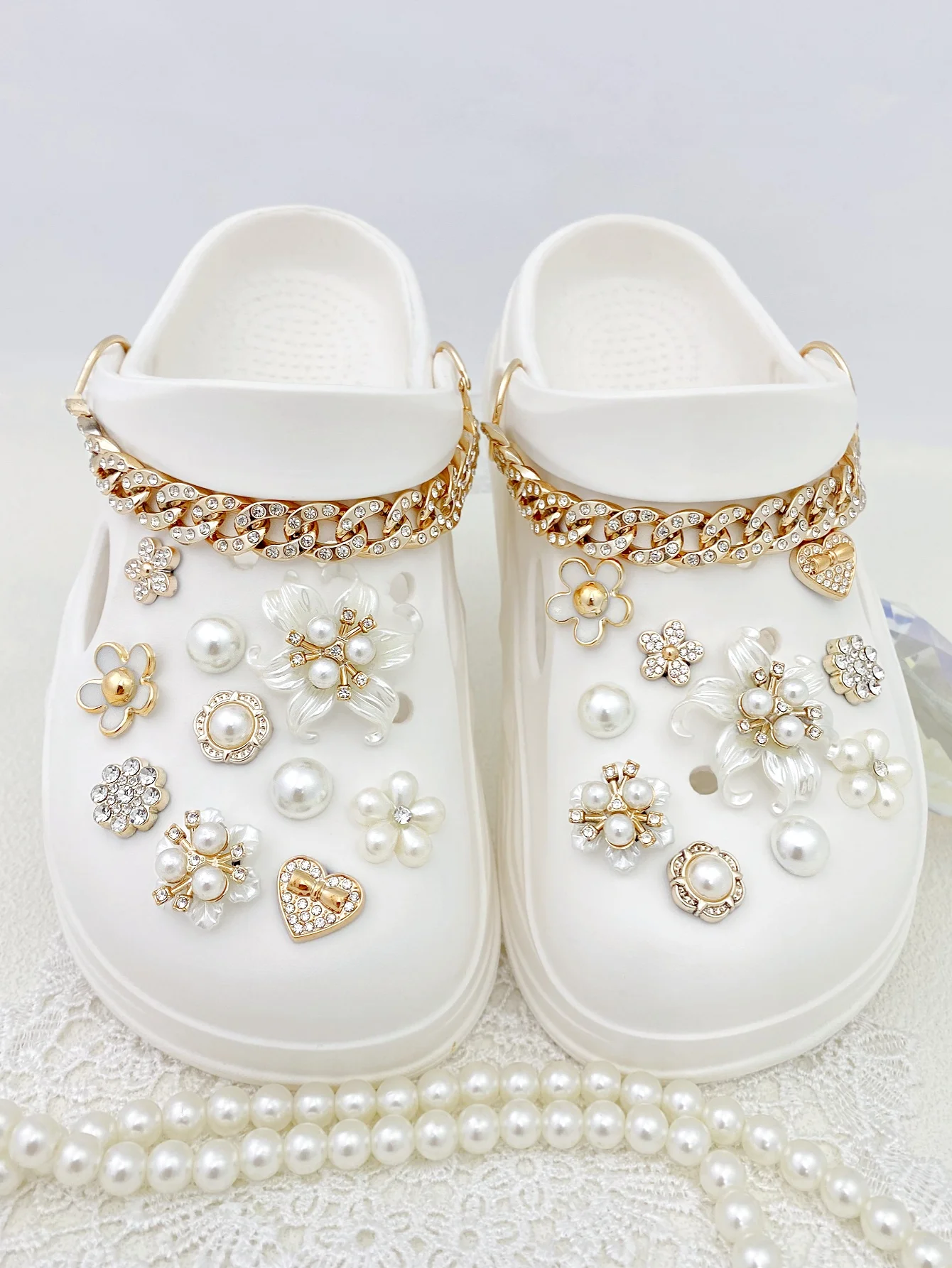22 pieces of golden diamond chain, white ABS pearl flower, golden heart bow, flower, white ABS pearl shoe buckle DIY decoration,