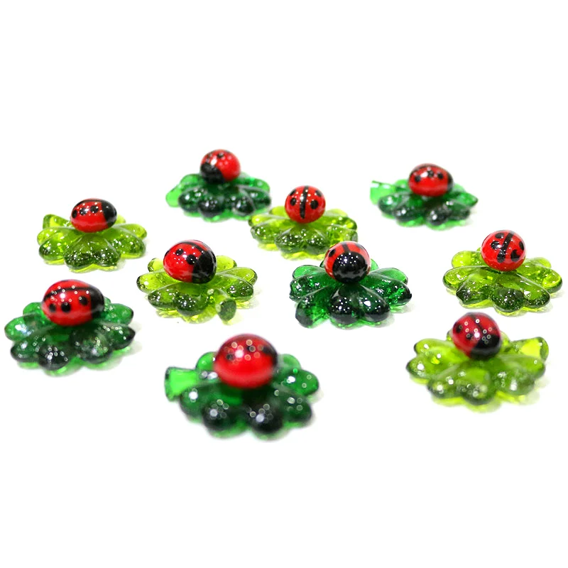 5pcs Green Mini Glass Four-Leaf Clover Ornaments with Cute Ladybug Figurine for Home Table Fairy Garden Bonsai Decor Accessories