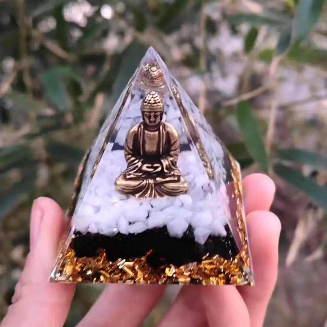 1pc Crystal Organite Pyramid Buddha Statue, Positive Orgonite Pyramid, aogn character statue for home decoration and meditation