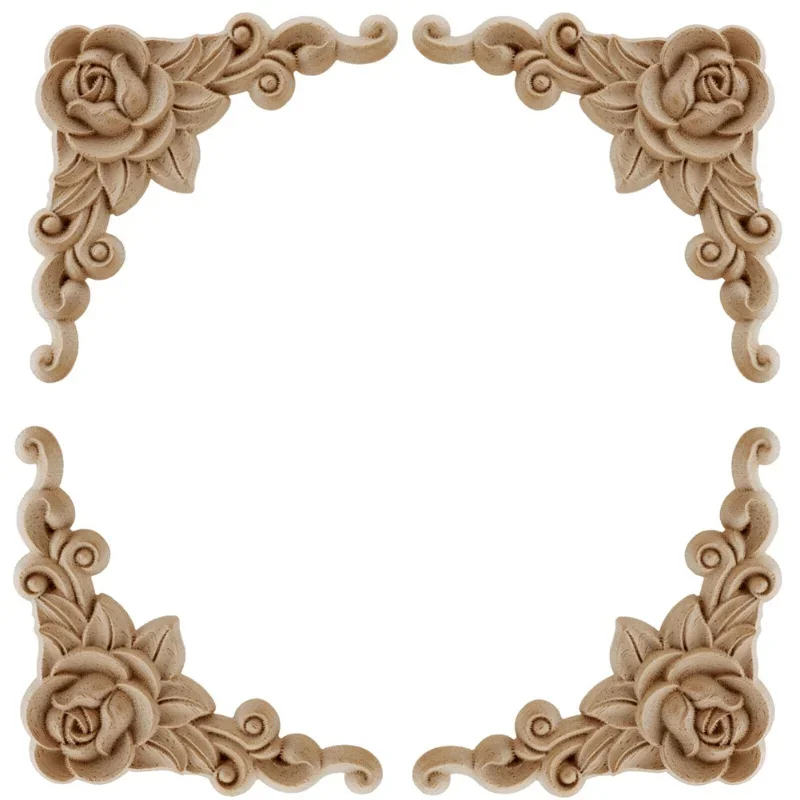 4pcs Natural Floral Wooden Figurines Crafts Wood Carved Corner Appliques Frame Wall Door Furniture Woodcarving Decorative