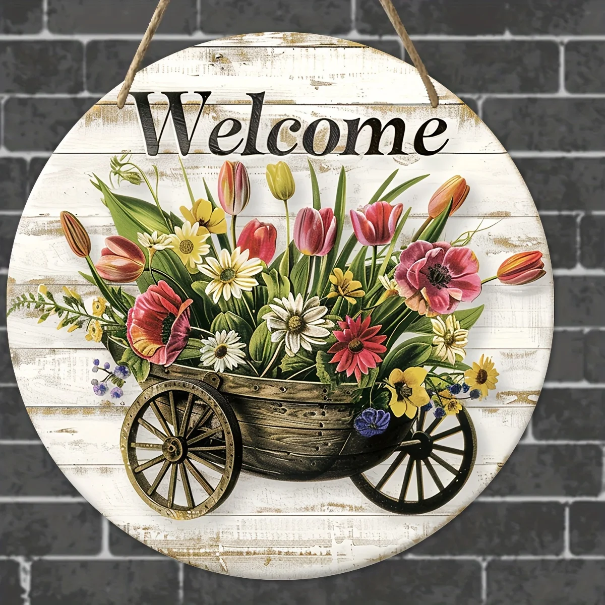 A welcome sign with pattern design -1 round artificial wood hanging sign, suitable for home, room, festival, coffee shop