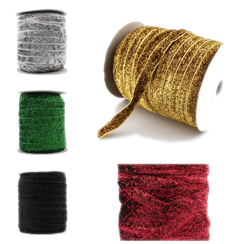 50yards/lot 1color=50yards 3/8" Elastic Glitter Velvet Ribbon Ornaments Metallic Elastic Band for Baby Girls Hair Accessories
