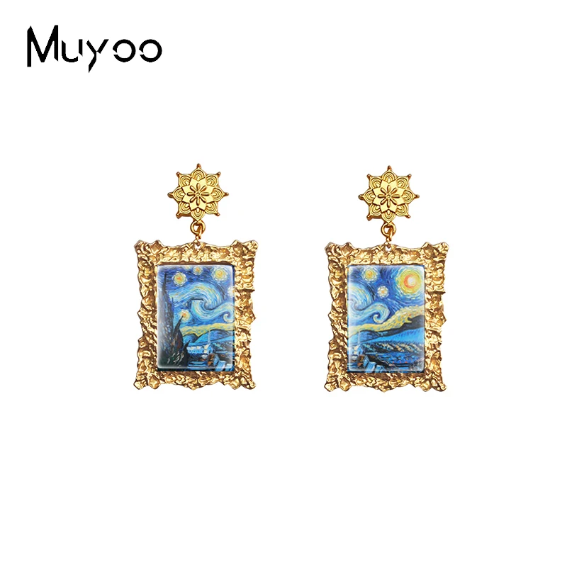 New Arrival Vintage Famous Starry Night Sunflower Oil Paintings Antique Mandala Rectangle Glass Cabochon Vintage Drop Earrings