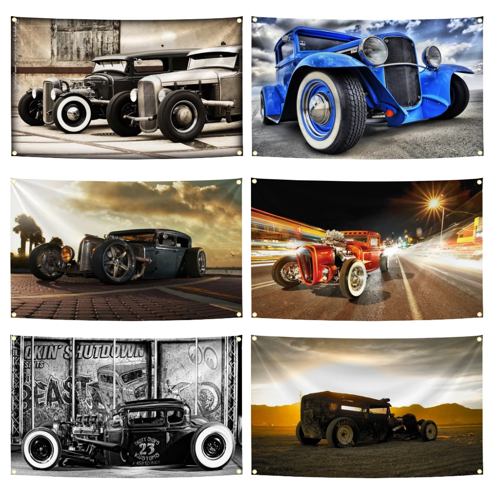 90x150cm Hot Rod Cars Racing Car Flag Tapestry Polyester Digital Printing Banner for Garage Wall Art Out Door Decoration