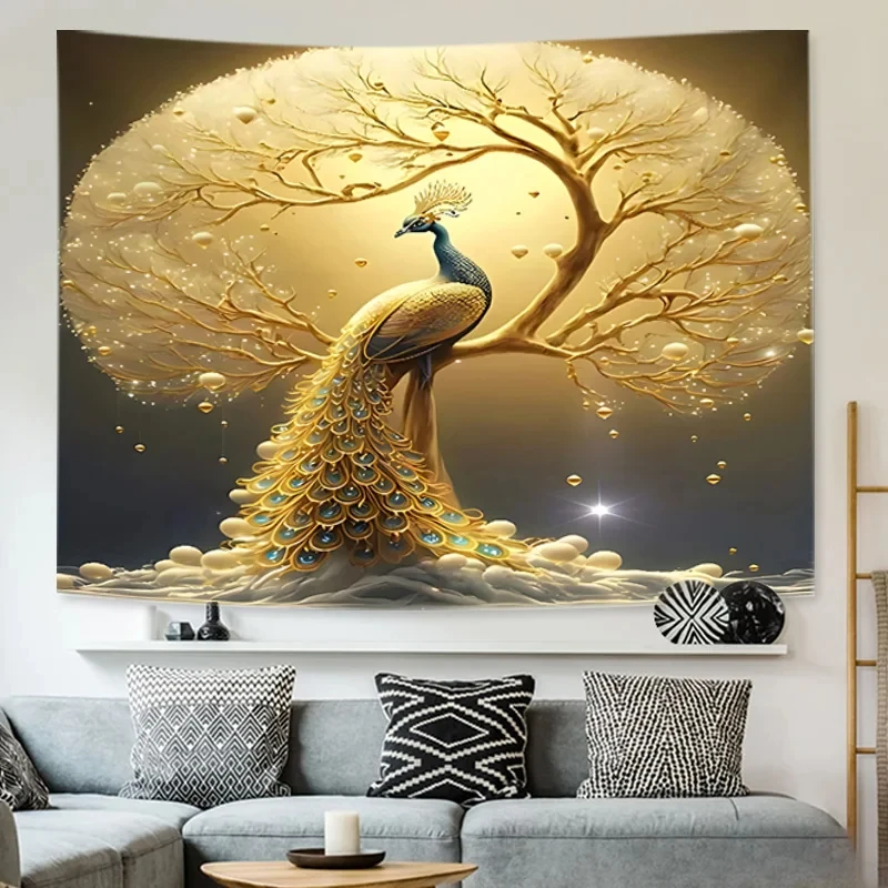 Home Decor Golden Peacock Money Tree Tapestry Polyester Wall Hanging Suitable For Bedroom And Living Room Decoration