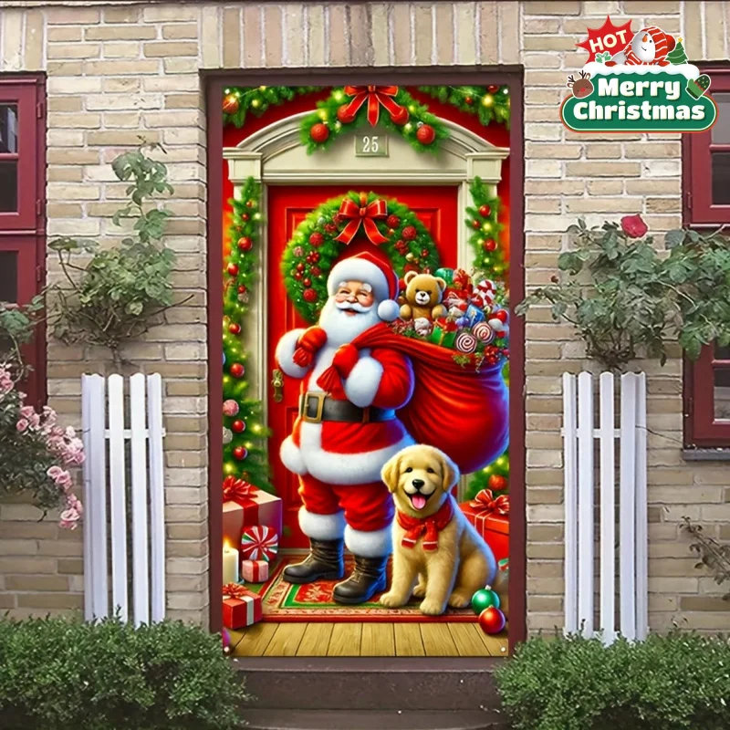 1Pieces2DFlat Santa Claus and Golden Retriever Christmas Door Banner ,Includes Santa's sleigh、No Power Supply Required