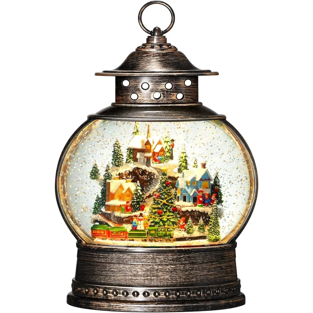 12-Inch Village Snow Globe Lantern with Lighted Christmas Decorations, Indoor Glitter, and Music Timer for Navidad