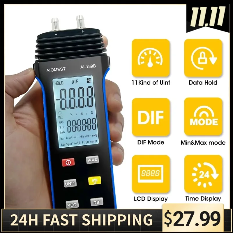 Manometer Gas Pressure Tester ±206.8Kpa, Digital HAVC Manometers with Protective Cap, 11 Units, Backlit, Data Storage