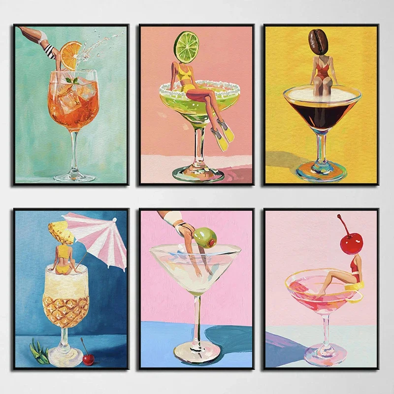 Coffee Martini Cocktail Margarita Drink Girl Jumping Into Wine Glass Fun Poster Canvas Printing Wall Art Bar Club Kitchen Dec