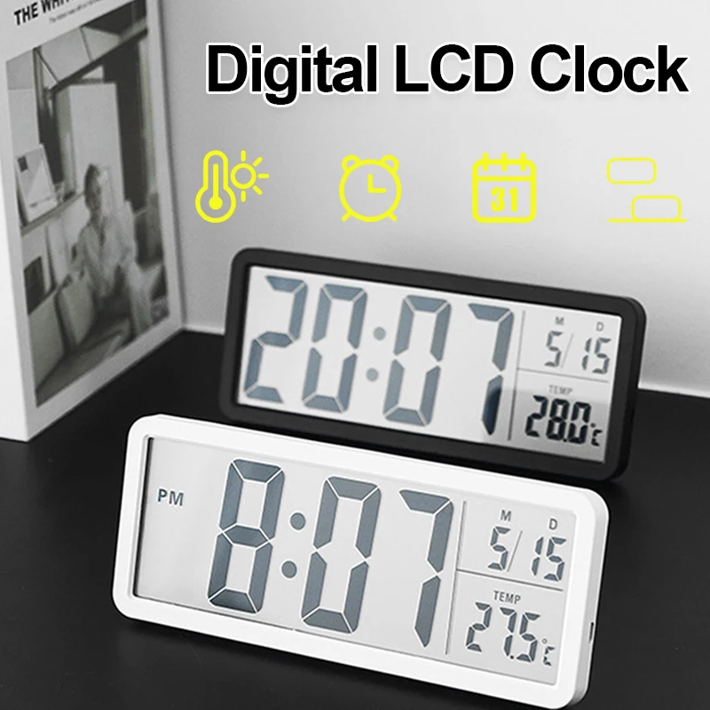 Digital Wall Clock Electronic Wall Mounted LCD Clock Modern Desktop Alarm Clock Bedroom Home Decor with Date Temperature Display