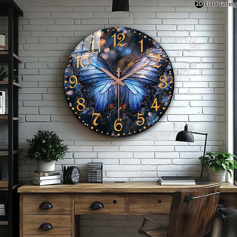Wooden Silent Wall Clock Blue butterfly clock face Quartz Clocks Farmhouse, Office, Idea Christmas, Halloween, New Year Gift