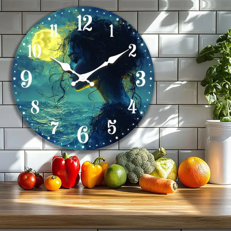 1pc 2D-Flat Woman moonlit ocean backdrop Quartz Round Analog Wooden Silent Wall Clock Perfect Christmas gift for friends etc  Read more