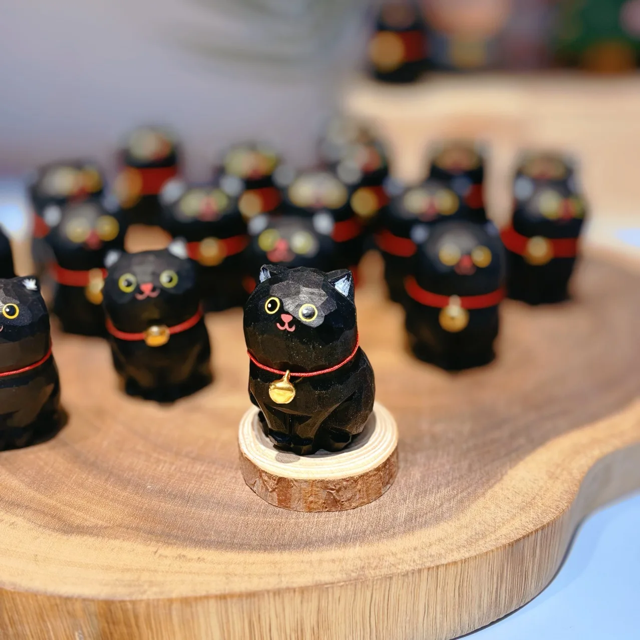 Cute Black Cat Ornamnet Wood Handmade Carved Animal Figurines for Home Office Desktop Decorations Crafts Cute Pet Lover Gift