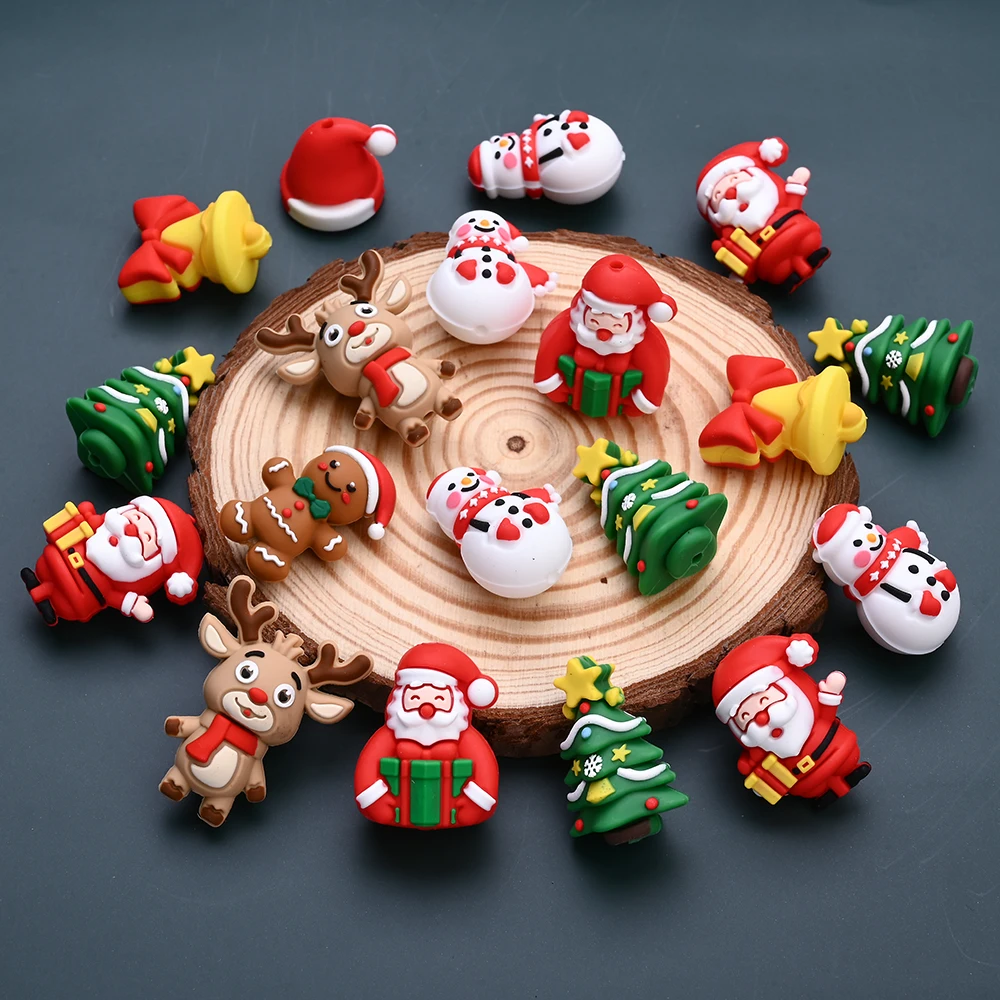 10Pcs 3D Christmas Theme Silicone Beads 3D Santa Claus Penguin Christmas Tree Shaped Decoration Beads for Jewelry DIY Making