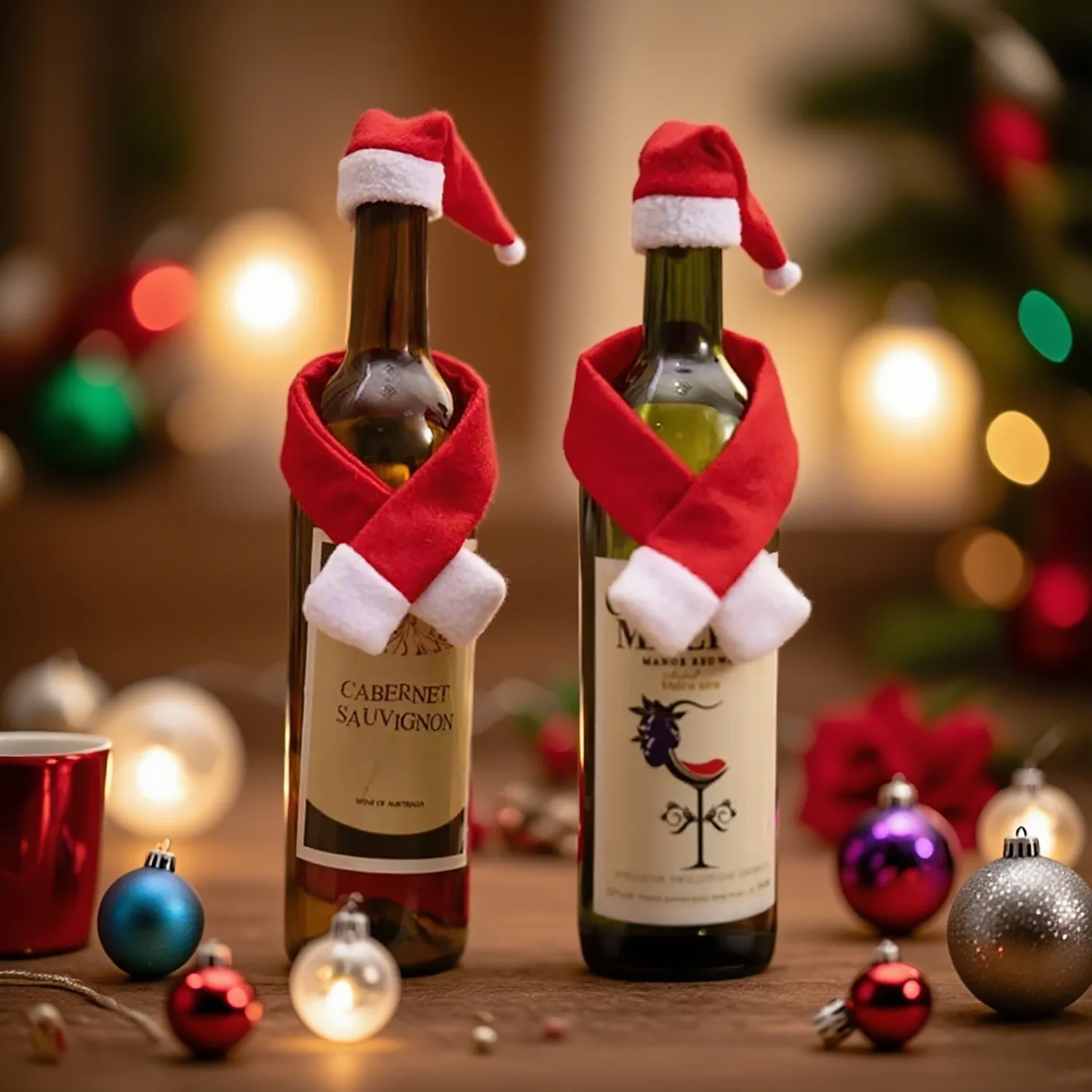 3sets Red Santa Claus Hat Scarf Wine Bottle Cover Decor Set,for Christmas Party DIY Home Hotel Table Decor