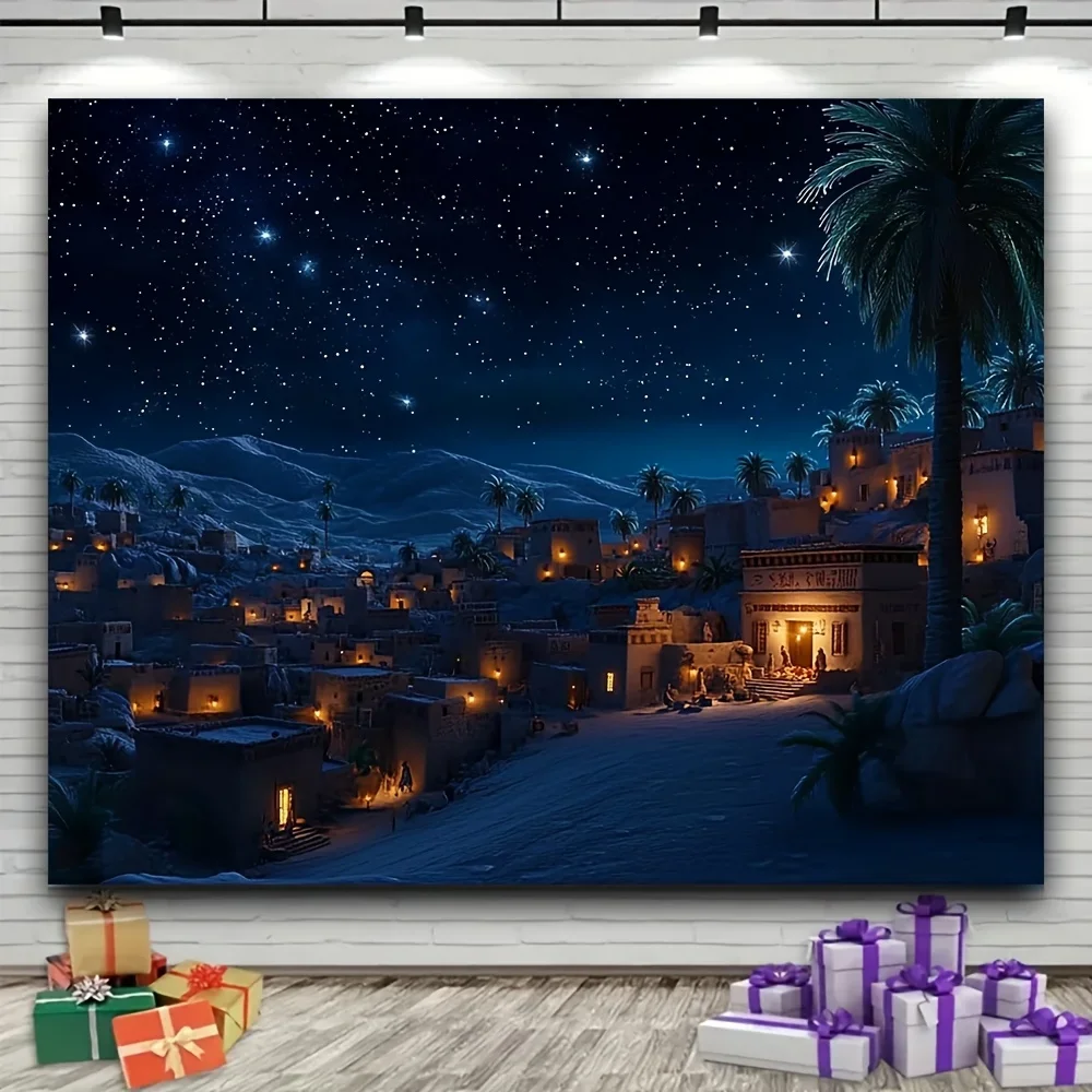 1pc Starry Night Manager and Village Christmas Scene Background - Polyester banner for holiday decoration, Christmas