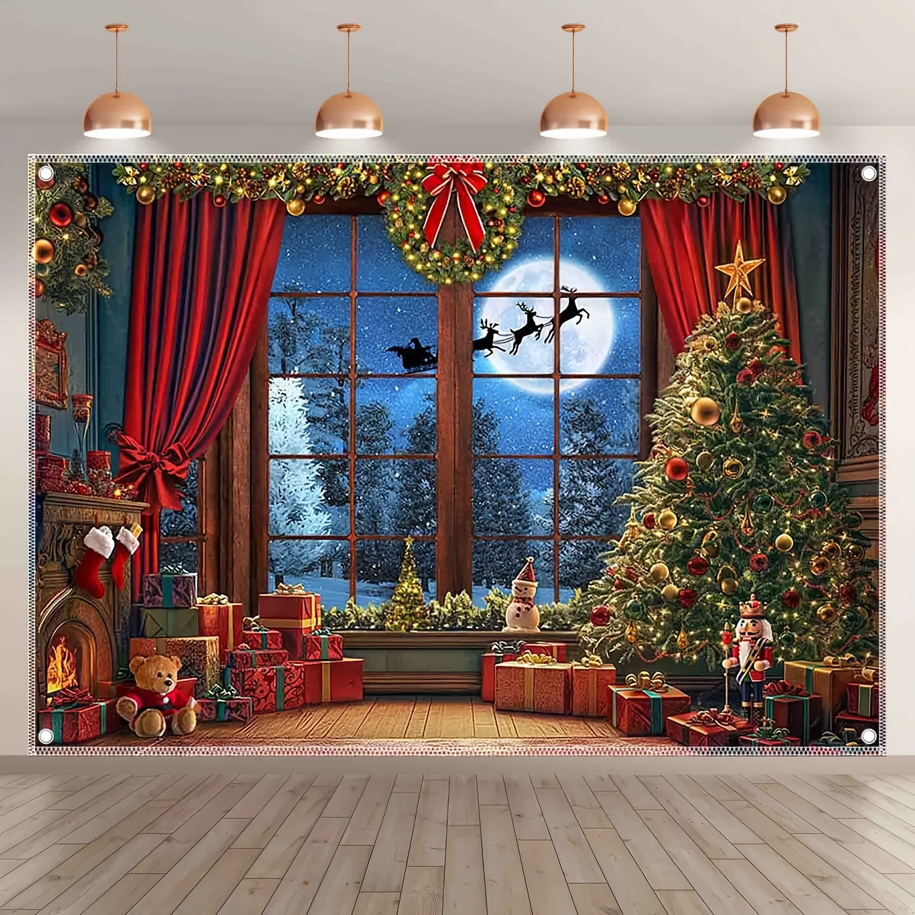 Christmas photography background with moon, deer, tree, red curtains, snowman, starry sky forest, holiday wall hanging flag  Read more