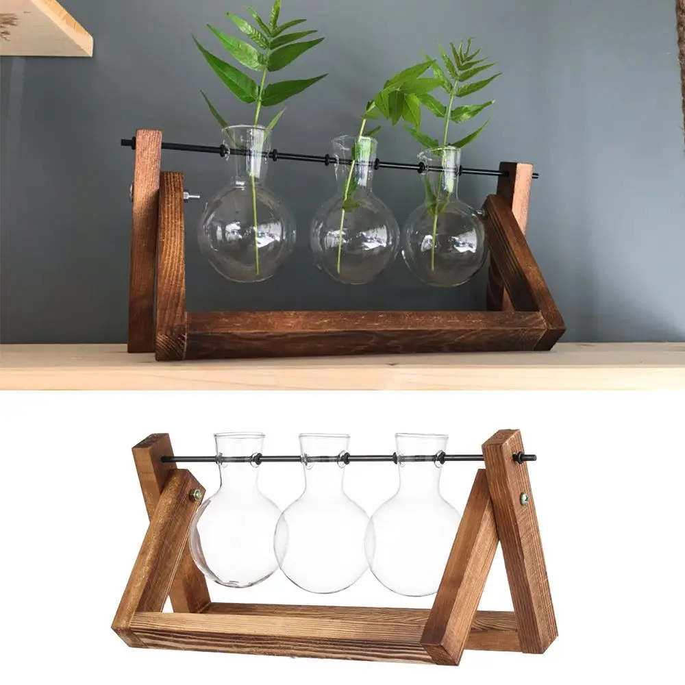 Hydroponic Plant Vases Glass Vase Vintage Bonsai Flower Pot Terrarium Tabletop Tray Wooden Frame Home Decor