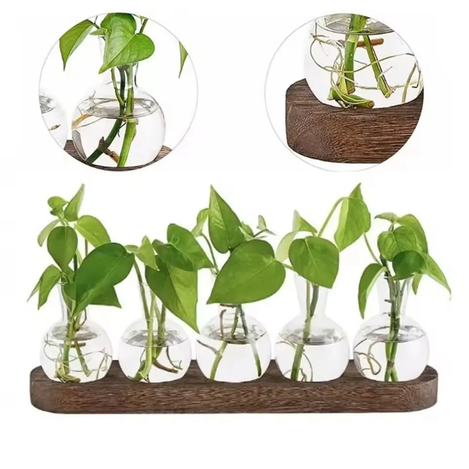 Modern Transparent Hydroponics Glass Vase with Wooden Tray Creative Plant Terrarium Propagation Station Desktop Decorating Vase
