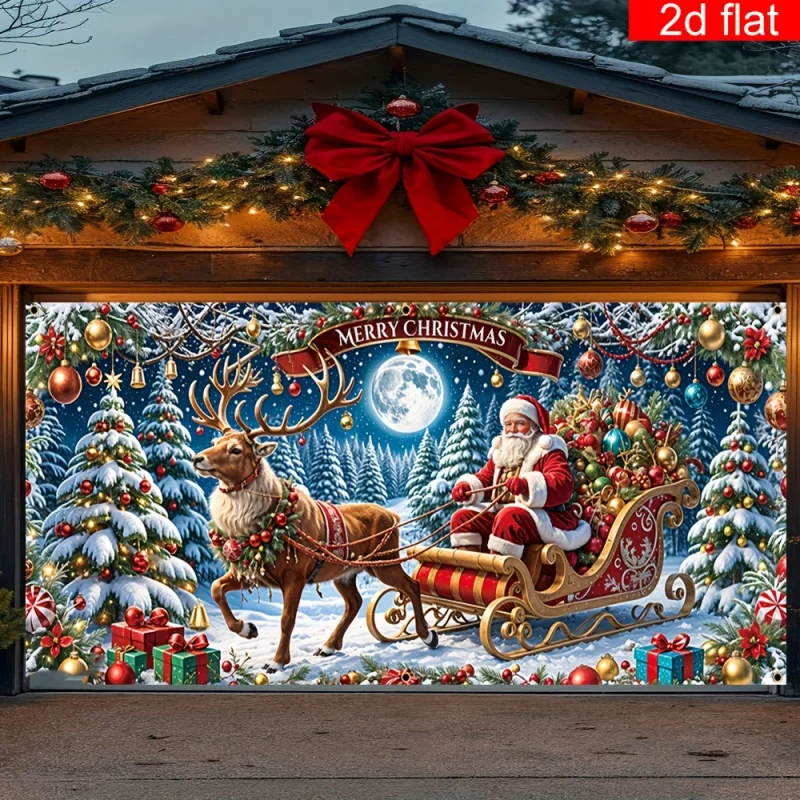 1pc Christmas Theme Garage Door Large Mural Decoration Banner,Moon Santa Claus Reindeer Stained Glass Ball Pattern Party Banner