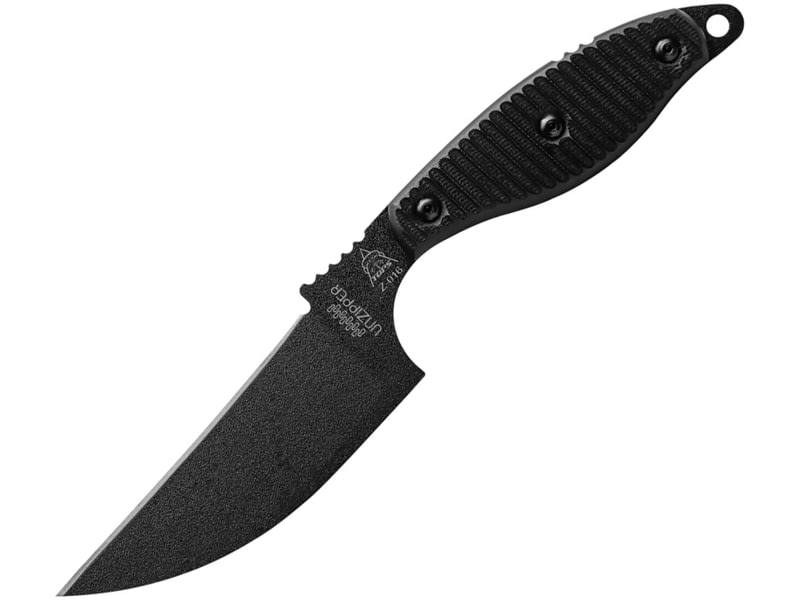 TOPS Knives Unzipper Fixed Blade Knife by Leo Espinoza 7.75in Overall 4.25in Black Traction 1095HC Steel Blade Black G10 Handle Kydex Sheath UNZ01