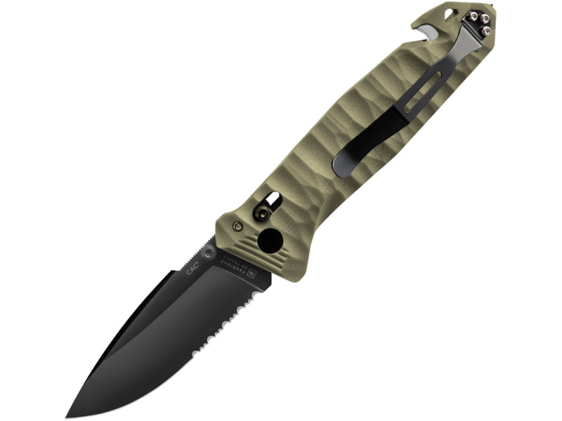 TB Outdoor C.A.C. Utility Axis Lock Folding Knife 5.5in Closed 3.75in Black Finish Partially Serrated Nitrox Steel Blade OD Green Sculpted PA6 Handle. Sculpted G10 handle. Belt/cord cutter. Glass breaker. Lanyard hole. Pocket clip. Thumb stud....  Read more